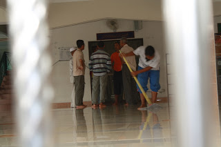 Zuraimi(Imam1) sedang memcuci lantai tempat wuduk.